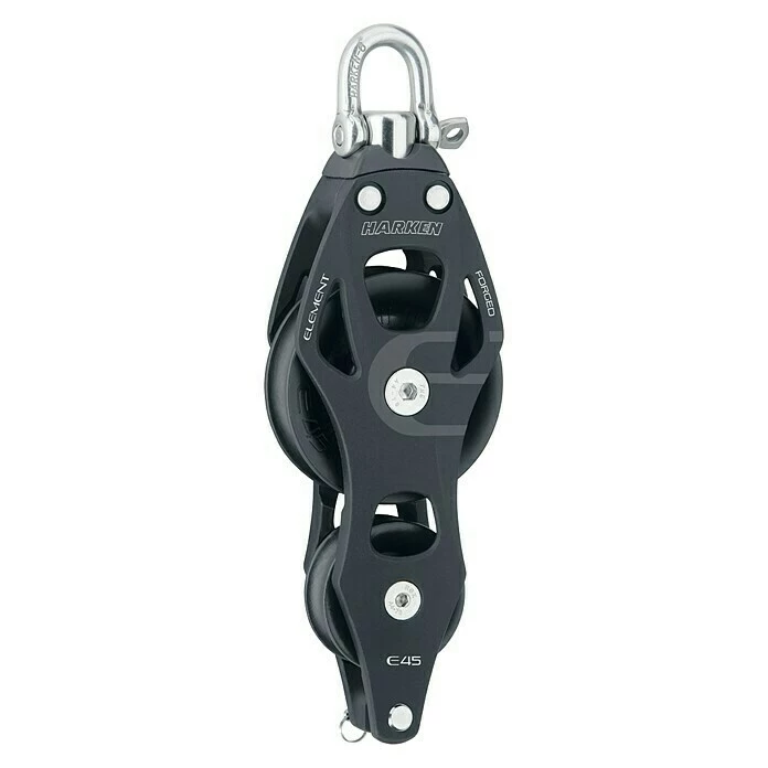 Der Violinblock mit Hundsfott von Harken ist eine neuartige und voll überarbeitete Ergänzung speziell für Fahrtenyachten. Die Gleitlagerblöcke sind aus geschmiedeten, oberflächengehärteten Aluminium Wangen und glasfaserverstärkten Nylon Scheiben gefertigt. Sie zeichnen sich durch hohe Stabilität, insbesondere bei statischen Lasten aus. Als Teil einer 4:1 oder 5:1 Talje ist der 45 mm Element Violinblock mit Hundsfott vielseitig einsetzbar. Für einen sicheren Anschlag sorgen geschmiedete Schäkel und drehbare Kopfzapfen aus Edelstahl. Der frei drehbare Pin lässt sich in zwei Positionen fixieren.