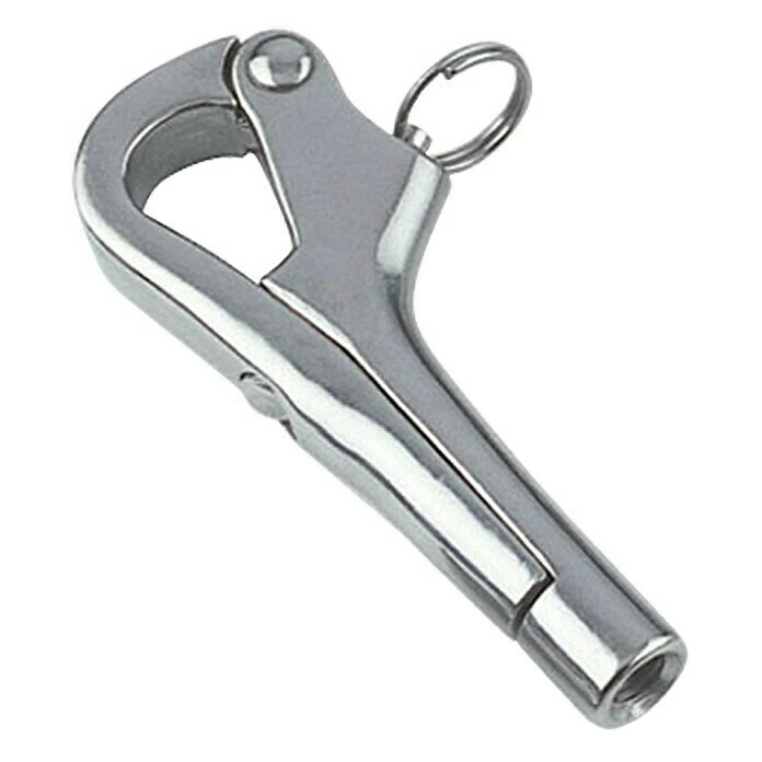 Der Pelikanhaken ist durch den speziellen Klappmechanismus vielseitig einsetzbar. Insbesondere bei Relingsdurchgängen ermöglicht er einfaches Öffnen und Schließen von gespannten Relingsdrähten. Dank des stabilen Splints ist ein sicherer Verschluss gewährleistet. Außerdem lässt sich der Pelikanhaken durch das Gewinde an der Unterseite sehr leicht montieren.